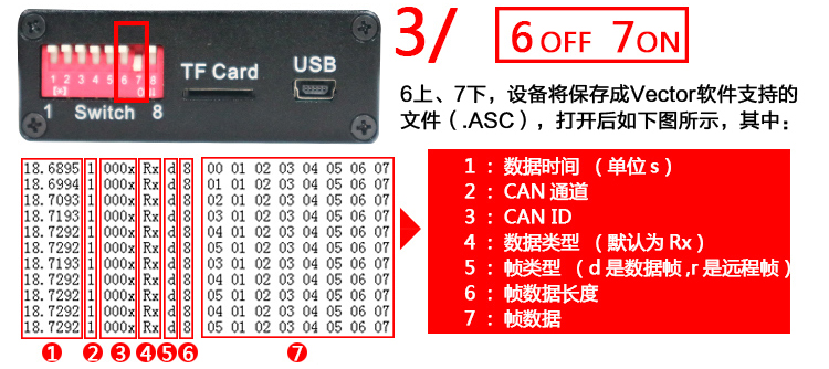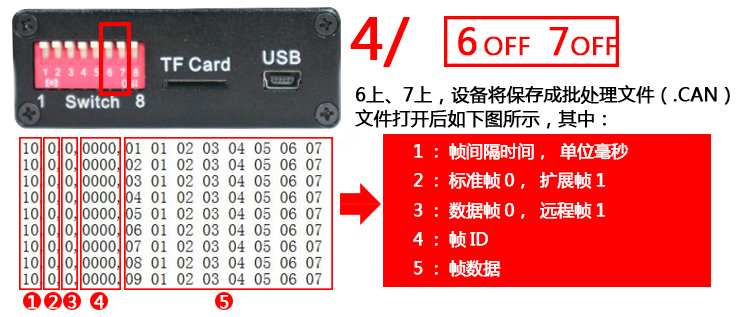 CAN總線數(shù)據(jù)存儲(chǔ)器支持四種保存數(shù)據(jù)格式:1)文本文件(.TXT)、2)二進(jìn)制文件(.DAT)、3)vector軟件支持的文件(.ASC)、4)批處理文件(.CAN)??赏ㄟ^8位撥碼開關(guān)中的第6、7兩個(gè)開關(guān)切換。切換方式如下圖所示: