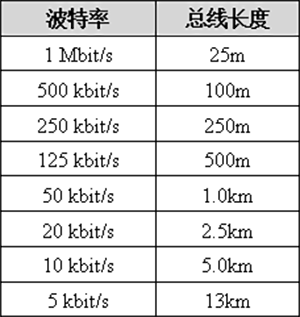 注意:CAN-bus電纜可以使用普通雙絞線、屏蔽雙絞線。理論最大通信距離主要取決于總線波特率,最大總線長度和波特率關(guān)系詳見下表。若通訊距離超過1Km,應(yīng)保證線的截面積大于Φ1.0mm2,具體規(guī)格應(yīng)根據(jù)距離而定,常規(guī)是隨距離的加長而適當(dāng)加大。