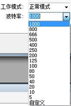 選中設(shè)備后,在下邊可以設(shè)置一些具體的工作模式和波特率。如您購買的是雙通道設(shè)備,可通過選項(xiàng)卡分別對(duì)CAN1、CAN2進(jìn)行設(shè)置,設(shè)置波特率尤為重要,此處設(shè)置波特率不可以手動(dòng)輸入,需要通過下拉菜單選擇,我公司產(chǎn)品支持如圖所示標(biāo)準(zhǔn)波特率:
