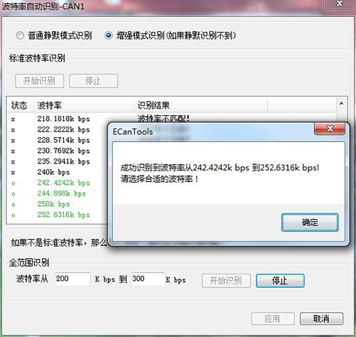 波特率自動(dòng)識(shí)別功能按檢索范圍的不同,可分為兩種模式:A.標(biāo)準(zhǔn)波特率識(shí)別(對(duì)標(biāo)準(zhǔn)的CAN波特率進(jìn)行一一識(shí)別),B.全范圍波特率識(shí)別(手動(dòng)輸入識(shí)別范圍,軟件將對(duì)范圍內(nèi)的波特率進(jìn)行全面匹配)。例如,某CAN總線系統(tǒng)的波特率未知,使用標(biāo)準(zhǔn)波特率識(shí)別顯示“沒有找到合適的波特率”時(shí),您可在“全范圍識(shí)別”區(qū)域設(shè)置波特率從5kbps識(shí)別到1000kbps,即可識(shí)別到所需的波特率。