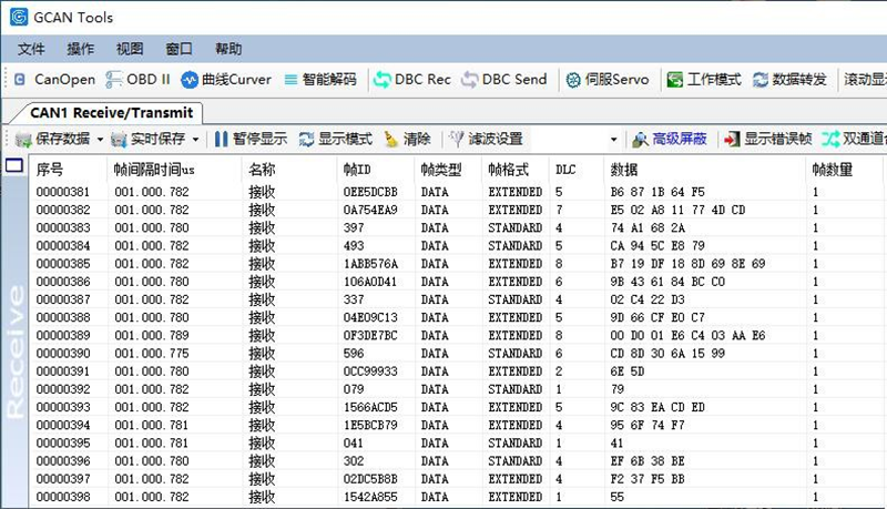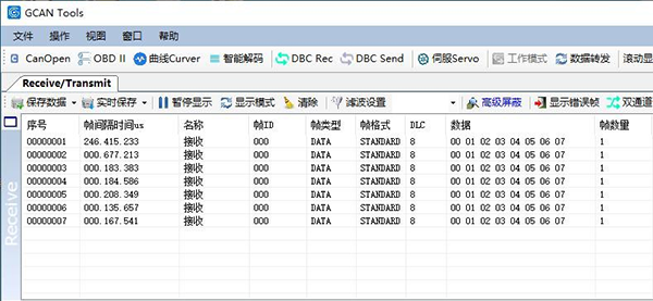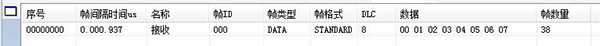 設(shè)備參數(shù)設(shè)置好后,軟件就進(jìn)入工作狀態(tài),如果總線上有數(shù)據(jù),這時(shí)接收數(shù)據(jù)窗口就會(huì)有數(shù)據(jù)顯示。接收窗口如下圖所示: