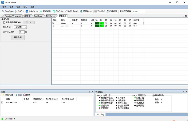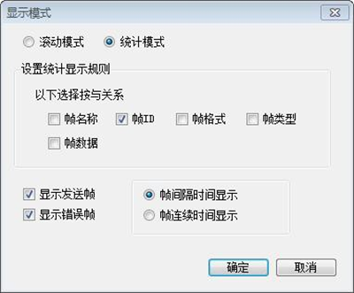 滾動(dòng)顯示是接收到的數(shù)據(jù)在接收列表中不停的向下滾動(dòng),當(dāng)前窗口看到的是最新的數(shù)據(jù);統(tǒng)計(jì)列表方式是按設(shè)置好的規(guī)則分類顯示,如可設(shè)置同一ID的數(shù)據(jù)包顯示統(tǒng)計(jì)在一起,后面有統(tǒng)計(jì)包數(shù)量。統(tǒng)計(jì)模式可方便工程師抓取總線上新產(chǎn)生的或有變化的數(shù)據(jù)。