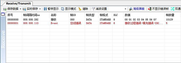 軟件可以捕獲總線上的錯(cuò)誤幀,當(dāng)接收到錯(cuò)誤幀時(shí),在接收列表中將以飄紅的形式顯示出來。