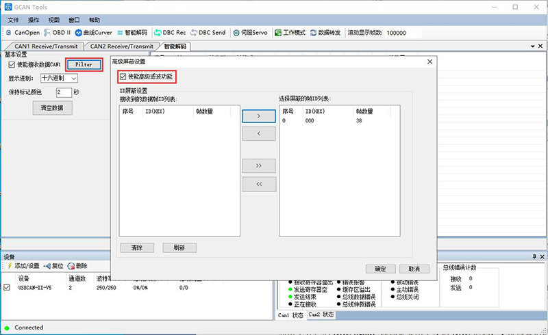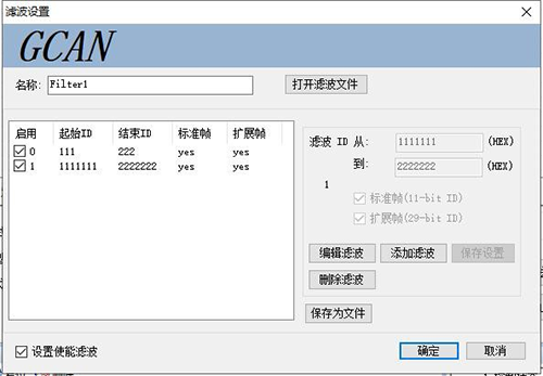 點(diǎn)擊“添加濾波”即可開始編輯,輸入想要過濾顯示的ID或ID段后點(diǎn)擊“保存設(shè)置”即可將濾波內(nèi)容添加到的左側(cè)。