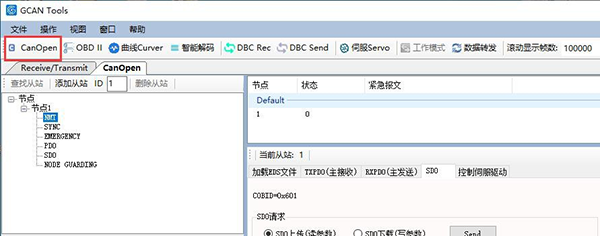 GCANTools軟件可接收到從站節(jié)點(diǎn)發(fā)出的EMERGENCY報(bào)文,該報(bào)文由出現(xiàn)緊急狀態(tài)的從節(jié)點(diǎn)發(fā)出,GCANTools軟件的CANopen主站功能可接收并處理此緊急報(bào)文。