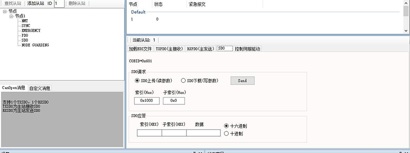 CANopen主站模塊的SDO功能分為發(fā)送SDO和接收SDO,用于讀寫對(duì)象字典。SDO為服務(wù)數(shù)據(jù)對(duì)象,英文全稱Service data object,有指定被接收節(jié)點(diǎn)的地址(Node ID),并且需要指定的接收節(jié)點(diǎn)回應(yīng)CAN報(bào)文來確認(rèn)已經(jīng)接收,如果超時(shí)沒有確認(rèn),則發(fā)送節(jié)點(diǎn)將會(huì)重新發(fā)送原報(bào)文。這種通訊方式屬于常見的“服務(wù)器客戶端”的通信模型,即我們常說的輪詢式。