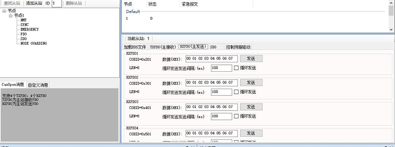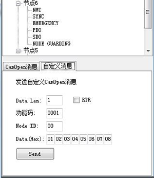 GCANTools軟件還可通過編輯自定義消息手動(dòng)模擬CANopen數(shù)據(jù),用戶可直接通過編寫功能碼、從站node ID、數(shù)據(jù)的方式直接向CANopen從站發(fā)送數(shù)據(jù)。
