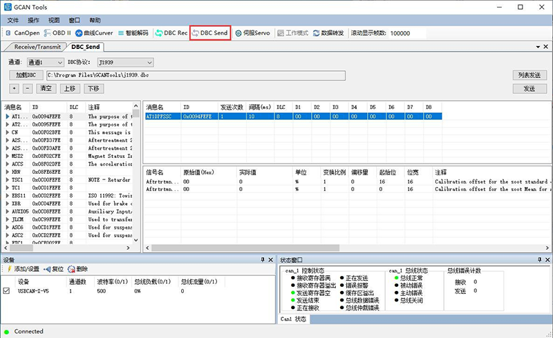 點(diǎn)擊工具欄的DBC Send,該標(biāo)簽頁用于發(fā)送DBC消息,支持每條消息獨(dú)立發(fā)送,互不干擾。發(fā)送界面如圖所示,左側(cè)表格為DBC消息選擇列表,右側(cè)上方表格為準(zhǔn)備發(fā)送的消息列表,右側(cè)下方表格為當(dāng)前選中消息的信號(hào)列表。