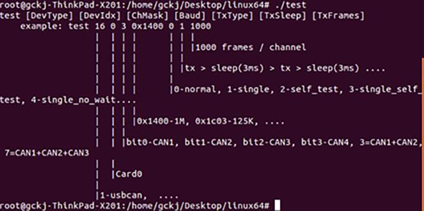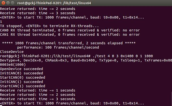 7、運(yùn)行測試程序測試USBCAN收發(fā)。輸入:./test