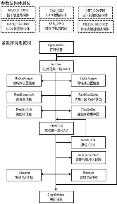 我公司為二次開發(fā)的用戶提供標(biāo)準(zhǔn)的接口函數(shù)庫,包括:ECANVCI.h、ECANVCI.lib、ECANVCI.dll。該接口函數(shù)庫均為標(biāo)準(zhǔn)格式,用戶可以在VC、VB、Labview等編程環(huán)境中,對(duì)這些接口函數(shù)聲明調(diào)用,具體使用方法詳見“ECAN動(dòng)態(tài)庫使用手冊(cè)”。下圖為常用結(jié)構(gòu)體名稱及函數(shù)庫調(diào)用流程。