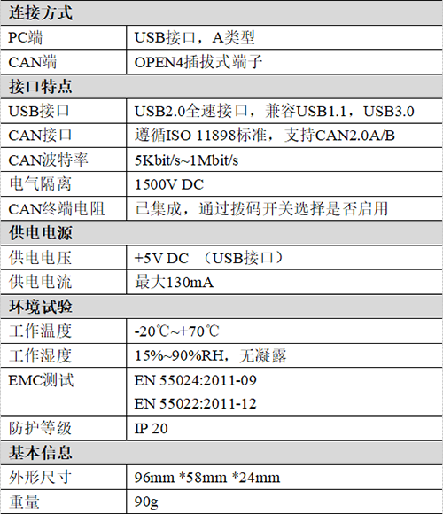 沈陽廣成科技USBCAN-I Pro高性能CAN接口卡的設(shè)備參數(shù)包括: