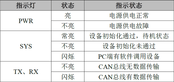USBCAN-I Pro接口卡指示燈狀態(tài)