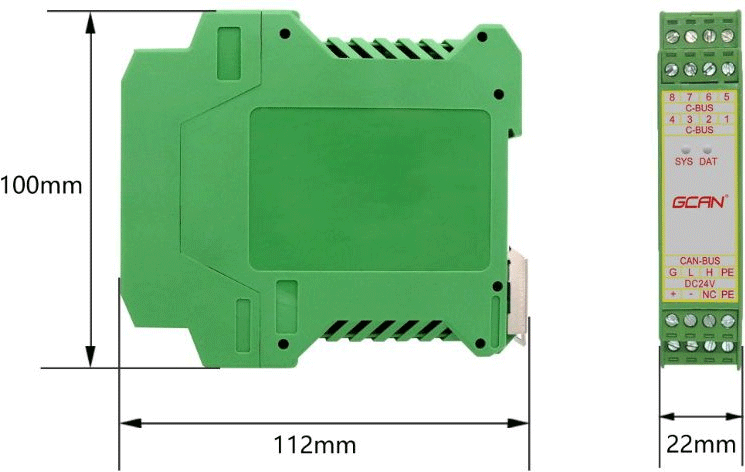 設(shè)備外形尺寸:(長,含接線端子)112mm*(寬)22mm*(高)100mm,其示意圖如圖所示。GCAN-204模塊外形尺寸