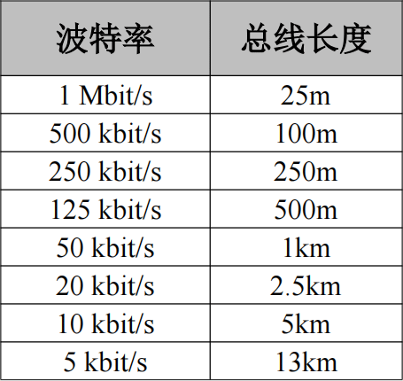 注意:CAN總線電纜可以使用普通雙絞線、屏蔽雙絞線。理論最大通信距離主要取決于總線波特率,最大總線長度和波特率關(guān)系詳見下表。若通訊距離超過1Km,應(yīng)保證線的截面積大于Φ1.0mm2,具體規(guī)格應(yīng)根據(jù)距離而定,常規(guī)是隨距離的加長而適當(dāng)加大。