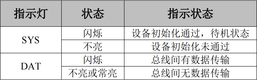 GCAN-204模塊具有1個SYS指示燈,用來指示設(shè)備的運行狀態(tài),1個DAT指示燈,用來指示數(shù)據(jù)傳輸。這2個指示燈的具體指示功能見下表,這2個指示燈處于各種狀態(tài)下時,CAN總線的狀態(tài)如表所示。GCAN-204模塊指示燈