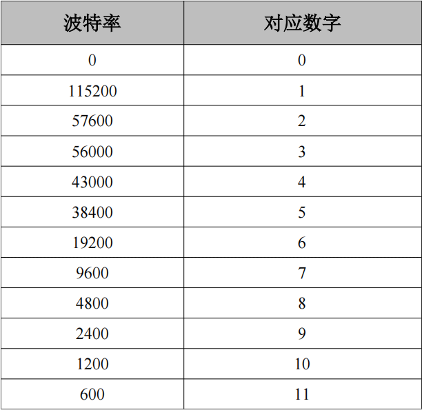 “Can Baudrate”——設(shè)置CAN端波特率;詳細(xì)設(shè)置如表所示RS485波特率與對應(yīng)數(shù)字對照表