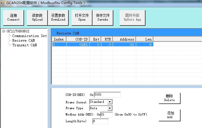 例如:配置Modbus從站地址為1,Modbus寄存器首地址為0x01(出廠預(yù)設(shè)值),功能碼為03,CAN為標(biāo)準(zhǔn)幀,幀ID為0x181,CAN幀數(shù)據(jù)為0x01,0x02,0x03,0x04,0x05,0x06,0x07,0x08。用戶Modbus主站發(fā)送請求幀:01 03 00 01 00 04 15 C9GCAN-204的響應(yīng)幀:01 03 08 02 01 04 03 06 05 08 07 17 C1