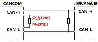 請注意:GCAN-201模塊內(nèi)部未集成120Ω終端電阻。如果節(jié)點數(shù)目大于2,中間節(jié)點不需要安裝120Ω的終端電阻。需要使用時,將電阻兩端分別接入CAN_H、CAN_L即可,如上圖所示。