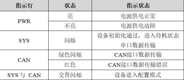 GCAN-201模塊具有1個PWR指示燈、1個SYS指示燈、1個CAN指示燈來指示設備的運行狀態(tài)。這3個指示燈的具體指示功能及狀態(tài)如下表所示。GCAN-201模塊指示燈狀態(tài)