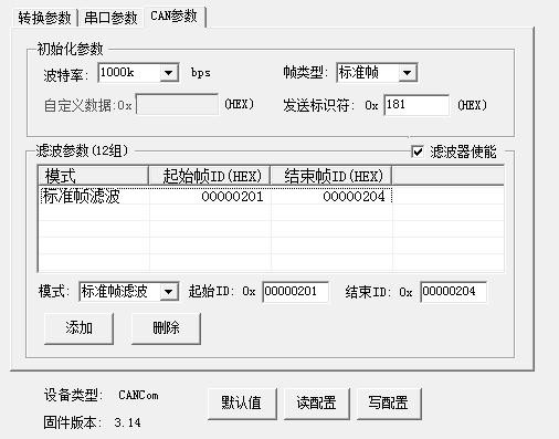 可在“CAN參數(shù)”選項卡中設置發(fā)送標識符,此發(fā)送標識符為串行總線發(fā)送到CAN總線時的幀ID。此ID設置詳見“4.5配置CAN參數(shù)”。