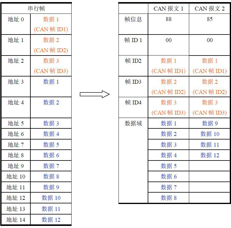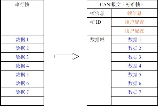 CAN報文的格式不變,只是CAN相應的幀ID也會被轉(zhuǎn)換到串行幀中。(2)轉(zhuǎn)換方式