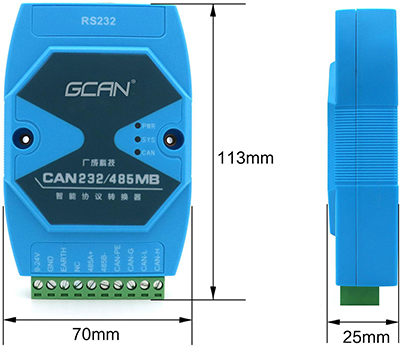 設備外形尺寸:(長,含接線端子)113mm*(寬)70mm*(高)25mm,其示意圖如圖所示。GCAN-201外形尺寸