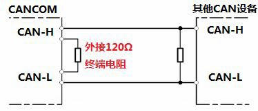 請注意:GCAN-207模塊內(nèi)部未集成120Ω終端電阻。如果節(jié)點(diǎn)數(shù)目大于2,中間節(jié)點(diǎn)不需要安裝120Ω的終端電阻。需要使用時(shí),將電阻兩端分別接入CAN_H、CAN_L即可,如圖所示。