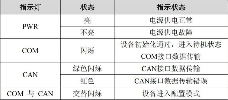 GCAN-207模塊具有1個(gè)PWR指示燈、1個(gè)COM指示燈、1個(gè)CAN指示燈來指示設(shè)備的運(yùn)行狀態(tài)。這3個(gè)指示燈的具體指示功能及狀態(tài)如表所示。GCAN-207模塊指示燈狀態(tài)