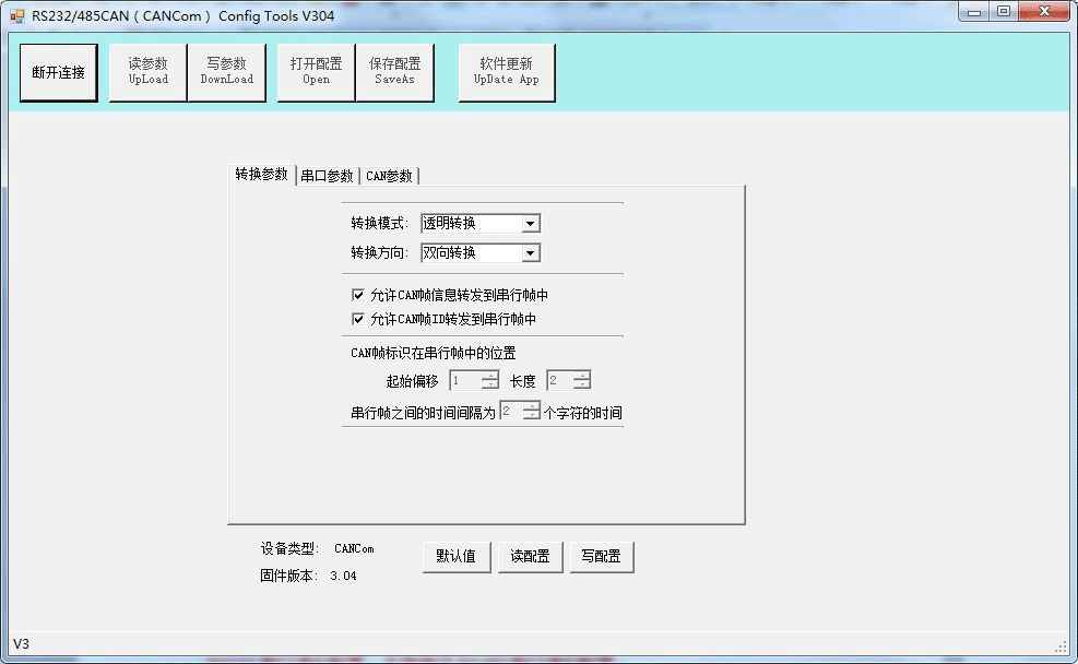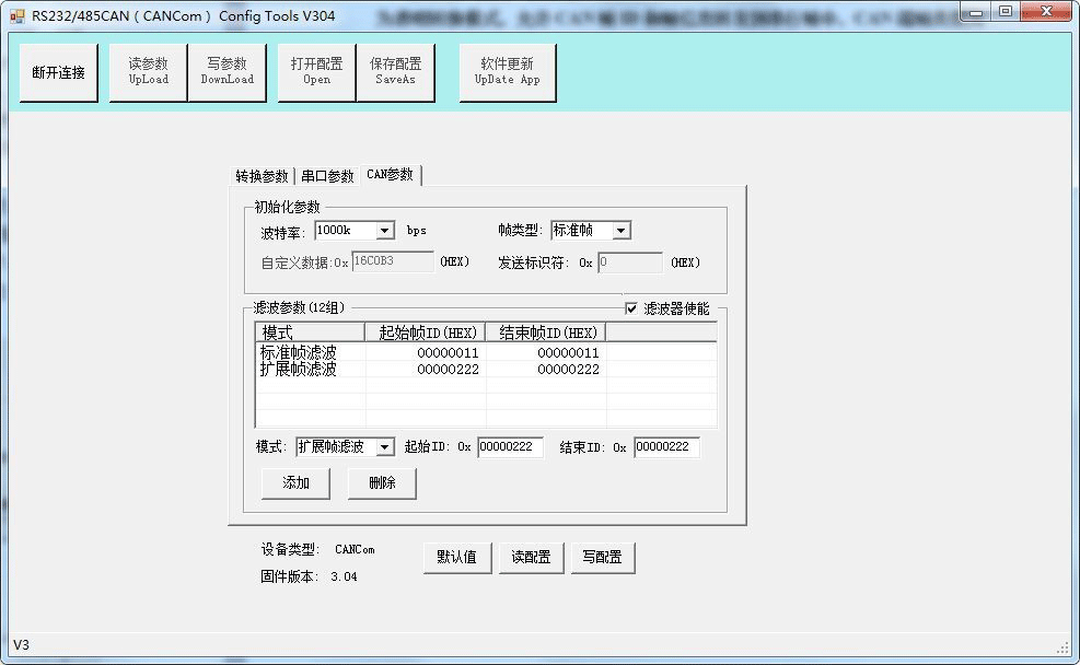 (12)使用RS232接口進(jìn)入CANCOM-Config-V304軟件配置工作模式及所有參數(shù);