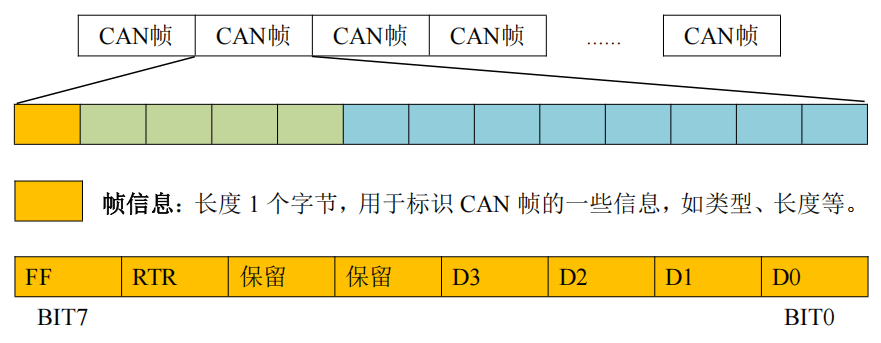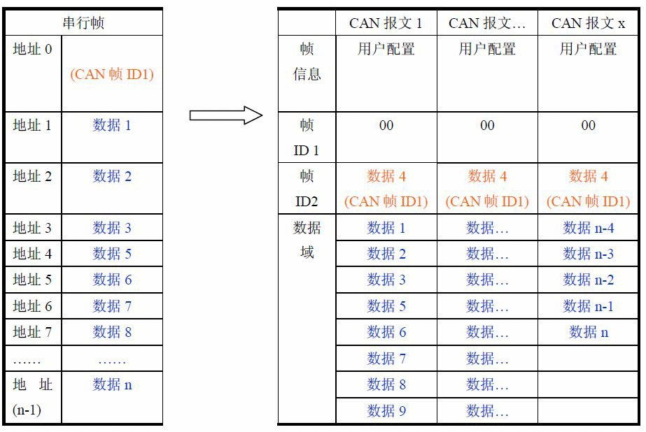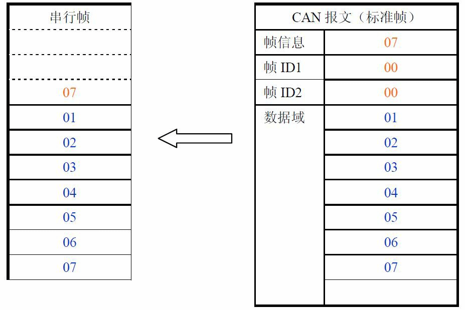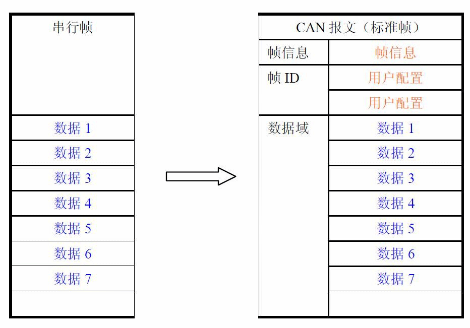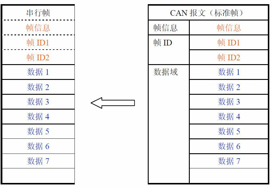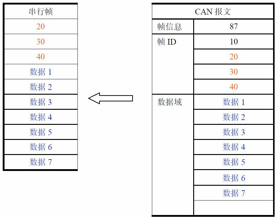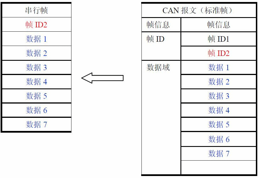 CAN報(bào)文的格式不變,只是CAN相應(yīng)的幀ID也會(huì)被轉(zhuǎn)換到串行幀中。(2)轉(zhuǎn)換方式