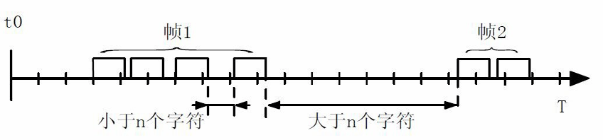 轉(zhuǎn)換器在串行總線空閑狀態(tài)下檢測到的首個(gè)數(shù)據(jù)作為接收幀的首個(gè)字符。傳輸中該幀內(nèi)字符間的時(shí)間間隔必須小于或等于傳輸n個(gè)字符(n的值由上位機(jī)事先配置)的時(shí)間。傳輸一個(gè)字符的時(shí)間是用該字符包含的位數(shù)除以相對(duì)應(yīng)的波特率。