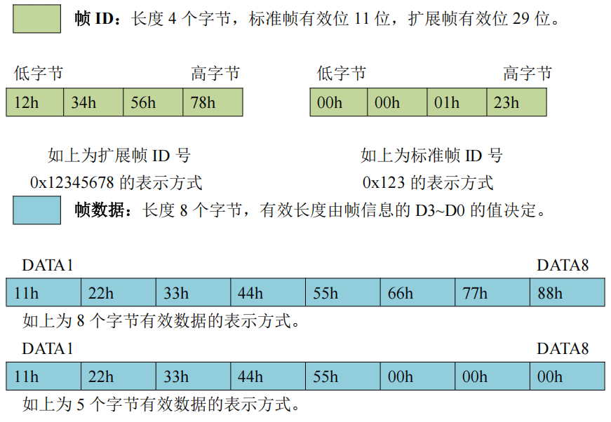 以下例子是一個(gè)擴(kuò)展數(shù)據(jù)幀,幀ID為0x12345678,包含8個(gè)字節(jié)有效數(shù)(11h,22h,33h,44h,55h,66h,77h,88h)的表示方式。以下例子是一個(gè)標(biāo)準(zhǔn)數(shù)據(jù)幀,幀ID為0x123,包含5個(gè)字節(jié)有效數(shù)據(jù)(11h,22h,33h,44h,55h)的表示方式。
