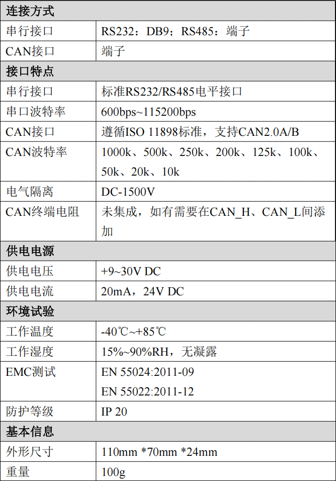 ● 一般情況下CAN波特率應(yīng)該是串口波特率的3倍左右,數(shù)據(jù)傳輸會(huì)比較均勻(因?yàn)樵贑AN總線傳輸數(shù)據(jù)的時(shí)候還附加了其他的功能域,相當(dāng)于增加了數(shù)據(jù)的長度,所以相同波特率下CAN傳輸?shù)臅r(shí)間會(huì)比串行總線的時(shí)間長)。九、技術(shù)規(guī)格