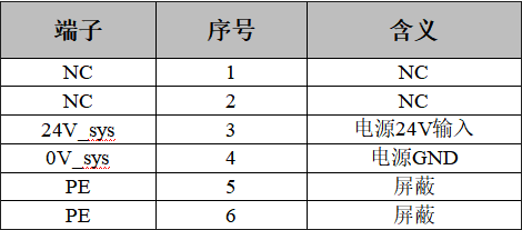 GCAN-IO-8201 EtherCAT總線耦合器的電源接線端子排如圖所示。GCAN-IO-8201 EtherCAT總線耦合器包含6個(gè)端子,各個(gè)端子對(duì)應(yīng)的序號(hào)及其含義如表所示。