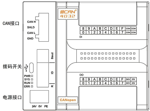 GCAN-4032遠(yuǎn)程IO是我公司基于CANopen總線自主研發(fā)的高性能總線同用遠(yuǎn)程IO模塊,為用戶節(jié)約成本,簡(jiǎn)化配線,提高系統(tǒng)可靠性,系統(tǒng)自帶16路DI和16路DO(輸出默認(rèn)晶體管PNP型,可選NPN型;輸入可通過(guò)接線切換源/漏型)。采用GCAN-4032模塊,用戶可用于采集數(shù)字量輸入信號(hào),并輸出數(shù)字量信號(hào),控制開(kāi)關(guān),實(shí)現(xiàn)遠(yuǎn)程開(kāi)關(guān)設(shè)備和CANopen網(wǎng)絡(luò)之間的連接,構(gòu)成CANopen網(wǎng)絡(luò)中數(shù)據(jù)量信號(hào)采集、輸出的控制節(jié)點(diǎn)。