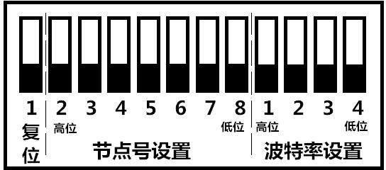GCAN-4032模塊撥碼開(kāi)關(guān)如圖所示,GCAN-4032模塊撥碼開(kāi)關(guān)最左側(cè)為復(fù)位按鍵,默認(rèn)在下方,為調(diào)試接口,請(qǐng)不要撥動(dòng)。復(fù)位按鍵右側(cè)7位為節(jié)點(diǎn)號(hào)設(shè)置開(kāi)關(guān)。最右側(cè)4位為波特率設(shè)置開(kāi)關(guān)。左側(cè)為高位,右側(cè)為低位。