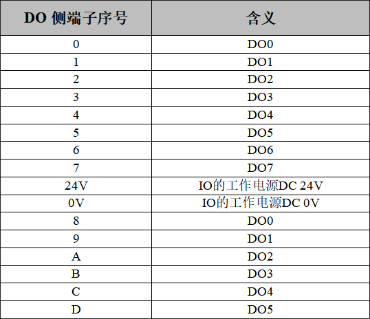 GCAN-4032的主控模塊含有上下四排端子排,下方兩排端子排為DO端子排,分別為DO0~DO7,DO8~DOF共16個(gè)數(shù)字量輸出點(diǎn),以及2組IO工作電源接口(請(qǐng)任選1組IO工作電源接口接入24V即可,注意同時(shí)需要接入系統(tǒng)電源,系統(tǒng)電源詳見(jiàn)下表,IO工作電源與系統(tǒng)電源彼此隔離),如圖所示。各個(gè)端子對(duì)應(yīng)的序號(hào)及其含義如下表所示。