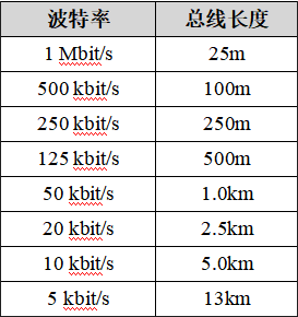 CAN-bus網(wǎng)絡(luò)的拓?fù)浣Y(jié)構(gòu)請(qǐng)注意:CAN-bus電纜可以使用普通雙絞線、屏蔽雙絞線。理論最大通信距離主要取決于總線波特率,最大總線長(zhǎng)度和波特率關(guān)系詳見(jiàn)下表。若通訊距離超過(guò)1km,應(yīng)保證線的截面積大于Φ1.0mm2,具體規(guī)格應(yīng)根據(jù)距離而定,常規(guī)是隨距離的加長(zhǎng)而適當(dāng)加大。