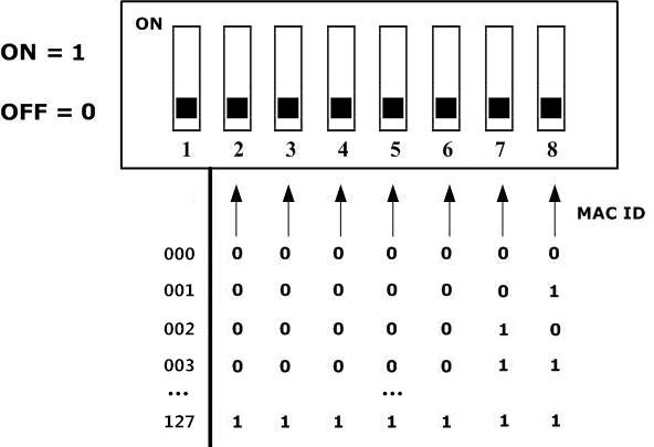 如圖所示,撥碼開(kāi)關(guān)的每個(gè)位撥向“ON“位置時(shí),該位為“1”,如果撥向“OFF”位置,則該位為“0”。撥碼開(kāi)關(guān)的2-8位用于設(shè)定模塊的節(jié)點(diǎn)號(hào)(MAC ID),第八位為最低位,第二位為最高位,模塊的節(jié)點(diǎn)號(hào)(MAC ID)是各位對(duì)應(yīng)的十進(jìn)制值之和,通過(guò)撥碼開(kāi)關(guān)設(shè)定模塊的節(jié)點(diǎn)號(hào)(MAC ID)的有效范圍為0~127。
