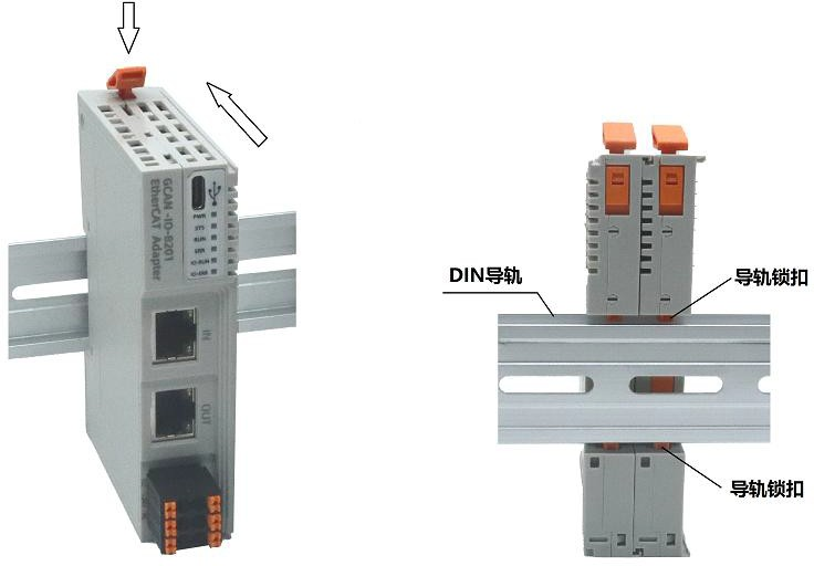GCAN-PLC-425可編程邏輯控制器的安裝方法如下圖所示。首先把GCAN-PLC-425可編程邏輯控制器安裝在導軌上,再按下鎖扣并發(fā)出“咔”的一聲。