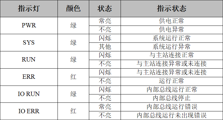 指示燈的具體指示、指示燈處于不同狀態(tài)下時,GCAN-PLC-425模塊狀態(tài)如下表所示。