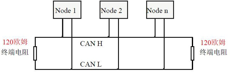 為了增強CAN通訊的可靠性,消除CAN總線終端信號反射干擾,CAN總線網(wǎng)絡最遠的兩個端點通常要加入終端匹配電阻,如圖所示。終端匹配電阻的值由傳輸電纜的特性阻抗所決定。例如雙絞線的特性阻抗為120Ω,則總線上的兩個端點也應集成120Ω終端電阻。如果網(wǎng)絡上其他節(jié)點使用不同的收發(fā)器,則終端電阻須另外計算。