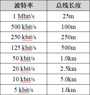 請注意:CAN-bus電纜可以使用普通雙絞線、屏蔽雙絞線。理論最大通信距離主要取決于總線波特率,最大總線長度和波特率關系詳見下表。若通訊距離超過1km,應保證線的截面積大于Φ1.0mm2,具體規(guī)格應根據(jù)距離而定,常規(guī)是隨距離的加長而適當加大。