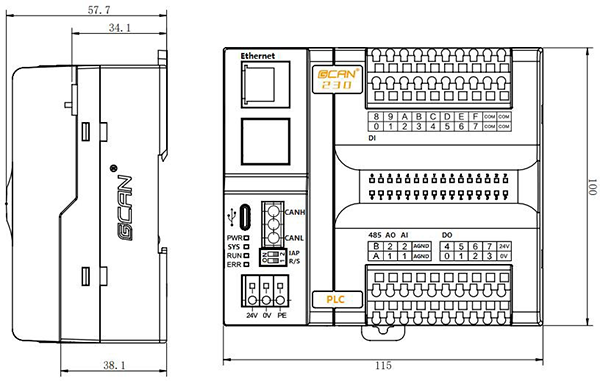 GCAN-PLC-230外觀如圖所示,(長(zhǎng))115mm*(寬)100mm*(高)58mm。