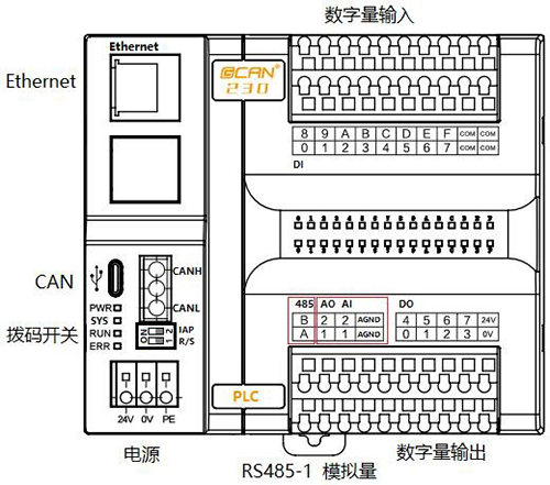 GCAN-PLC-230設(shè)備包含1個(gè)電源接口,一個(gè)USB-Type C接口,1路CAN通信接口,1路RS485通信接口,1路Ethernet通信接口,2路AI接口;2路AO接口;8路DO接口,16路DI接口。控制器編程接口使用Ethernet接口,接口定義如下表所示: