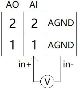 下方兩排端子排的左側(cè)為AI和AO端子排,分別為AI1~AI2兩個(gè)模擬量輸入點(diǎn),AO1~AO2兩個(gè)模擬量輸出點(diǎn),以及2個(gè)模擬量的公共端AGND接口(2個(gè)AGND口內(nèi)部已短接),如圖所示。AI、AO及AGND端子對(duì)應(yīng)的序號(hào)及其含義如表所示。