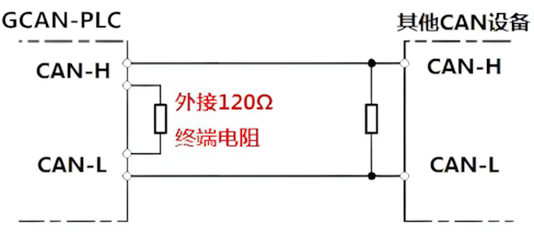 請(qǐng)注意:GCAN-PLC-230的CAN總線內(nèi)部未集成120Ω終端電阻。如果節(jié)點(diǎn)數(shù)目大于2,中間節(jié)點(diǎn)不需要安裝120Ω的終端電阻。需要使用時(shí),將電阻兩端分別接入CAN_H、CAN_L即可,如圖所示。