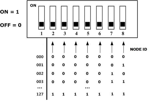 如圖所示,撥碼開關(guān)的每個(gè)位撥向“ON”位置時(shí),該位為“1”,如果撥向“OFF”位置,則該位為“0”。撥碼開關(guān)的2—8位用于設(shè)定模塊的節(jié)點(diǎn)號(hào)(NODE ID),第八位為最低位,第二位為最高位,模塊的節(jié)點(diǎn)號(hào)(NODE ID)是各位對(duì)應(yīng)的十進(jìn)制值之和,通過(guò)撥碼開關(guān)設(shè)定模塊的節(jié)點(diǎn)號(hào)(NODE ID)的有效范圍為0~127。