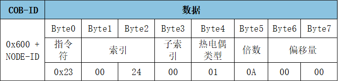 GCAN-4048模塊可通過(guò)發(fā)送SDO命令寫參數(shù),修改模塊每一路輸入的熱電偶類型、倍數(shù)、偏移量。該參數(shù)位于對(duì)象字典索引0x2401至2408、子索引0x00,數(shù)據(jù)類型Unsigned32。每一路的熱電偶類型、倍數(shù)、偏移量均可自由配置為不同類型。倍數(shù)的數(shù)據(jù)類型為Unsigned8,為了確定精度,必須大于0。偏移量的數(shù)據(jù)類型為INTEGER16,正負(fù)值均可。