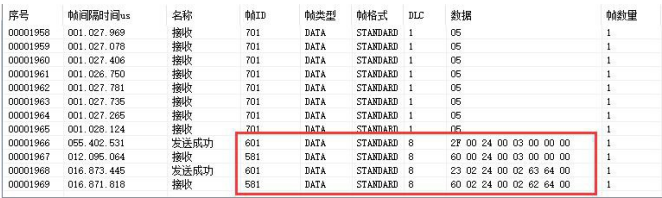 1、模塊配置為標(biāo)準(zhǔn)CANopen模式報(bào)文:ID:0x601數(shù)據(jù):2F 00 24 00 03 00 00 00,設(shè)置模塊為標(biāo)準(zhǔn)CANopen模式。